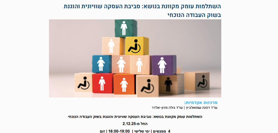 ביום 2.12.2025 תיפתח השתלמות עומק מקוונת בת ארבעה מפגשים, מטעם "המדרשה" של לשכת עורכי הדין בנושא סביבת העסקה שוויונית והוגנת בשוק העבודה הנוכחי. ההשתלמות תכלול סדרת הרצאות מרתקות ומעשיות העוסקות בגיוון תעסוקתי, שוויון הזדמנויות, והיבטי הפליה בשוק העבודה – לרבות הפליה מחמת גיל, סוגיות מגדריות בעולם העבודה, ופיתוח סביבת העסקה הוגנת. המפגש הראשון יהיה בנושא […]